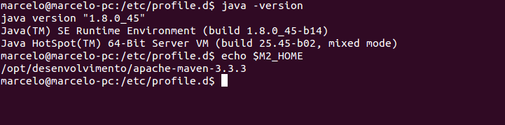 #!/bin/sh export JAVA_HOME=/opt/desenvolvimento/jdk1.8.0_45 export JRE_HOME=/opt/desenvolvimento/jdk1.8.0_45/jre export CLASSPATH=$CLASSPATH:.:$JAVA_HOME/lib:$JRE_HOME/lib export M2_HOME=/opt/desenvolvimento/apache-maven-3.3.3 export MAVEN_HOME=/desenvolvimento/apache-maven-3.3.3 export M2=/opt/desenvolvimento/apache-maven-3.3.3 export PATH=$PATH:$JAVA_HOME/bin export PATH=$PATH:$M2_HOME/bin